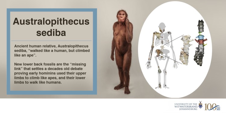 The remains dated to  about 2 mya, well older than Berger’s later work with naledi. The limbs of sediba made it clear, at least at the time, that this hominin was an arboreal primate, that it lived in the trees for most of its time, and most likely spent little time on the ground walking bipedally. However, as published in November 2021 as well, with Berger as the lead author, a block of breccia that was recovered from the original site in 2015, was placed in a high-resolution micro-CT scanner, and it was revealed that in this block, there were five lumbar vertebrae belonging to MH2, even showing a lumbar lordosis.