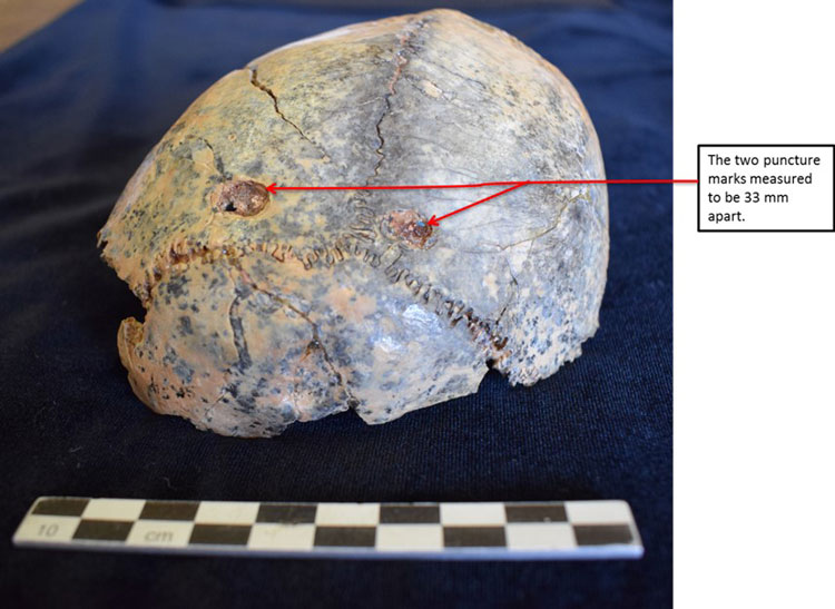 The skull cap fragment of a juvenile Paranthropus robustus, an extinct hominin relative, was uncovered in 1949, in a South African cave called Swartkrans, dating to 1.8-1.3 mya. On the back of the skull cap, near the lambdoid suture of the occipital bone, there are two puncture marks, matching the bite marks of a leopard. It seems that this individual was dragged away by the head by a leopard.