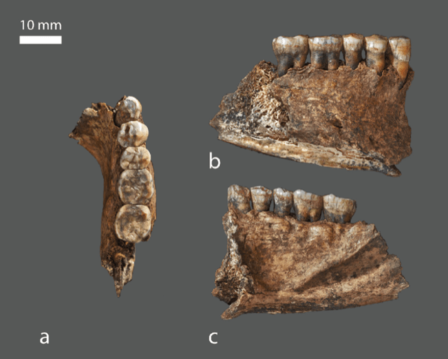 The mandible is broadly characterized by a robust mandibular corpus (the body of the mandible), and a more gracile mandibular symphysis and ramus (the front and back ends of the mandible). It also lacks a chin, showing that it can’t belong to H. sapiens. It does however share many other traits with other pleistocene hominin mandibles, including a pronounced alveolar planum, a superior transverse torus, a pronounced endocondyloid crest, and a well-developed medial pterygoid tubercle.